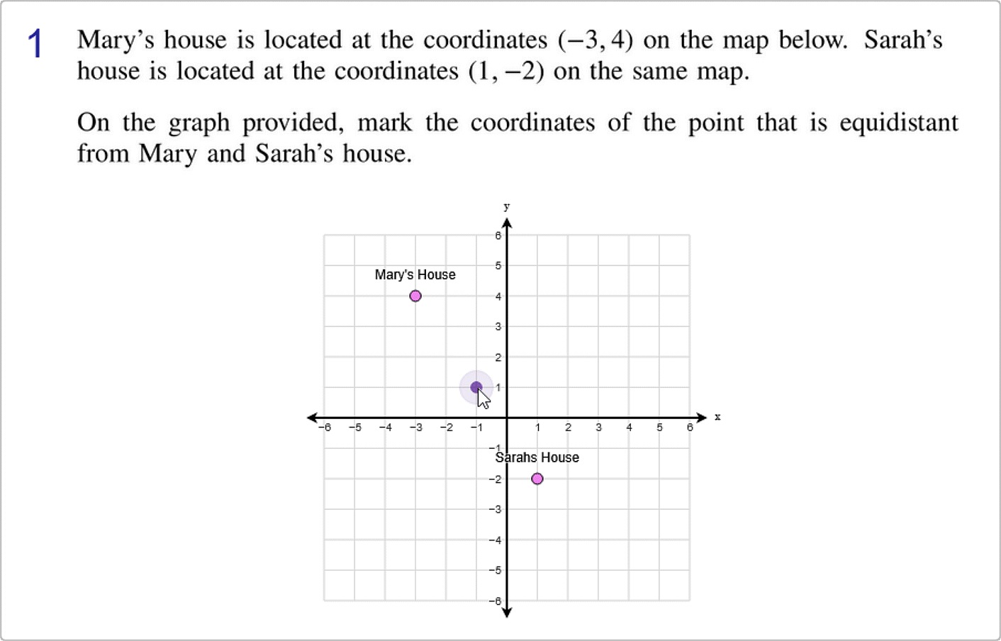 Below is an example of creating pre-drawn points for a question that asks for the midpoint between two student's houses.