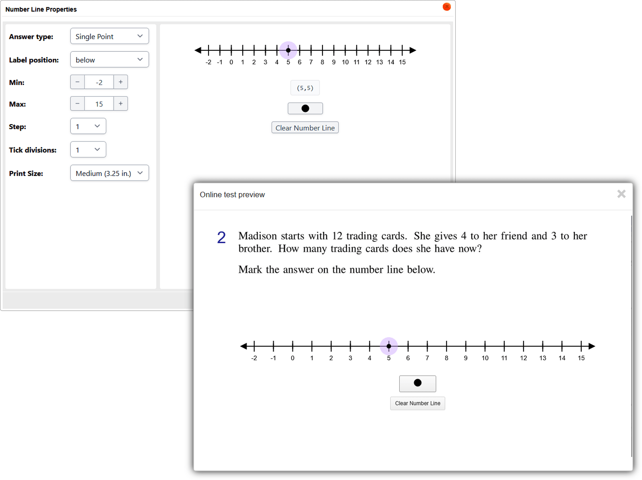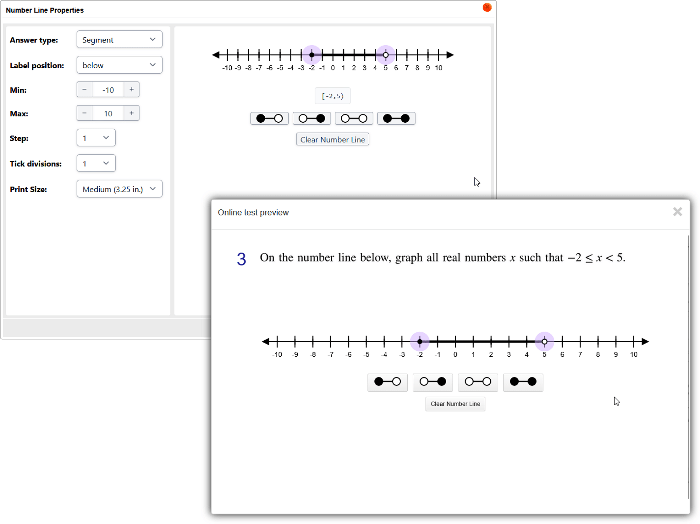 In the editor, click Online Test Preview to see how the number line question will look and behave in an online test. When you are done, close the Preview, then then click Save.